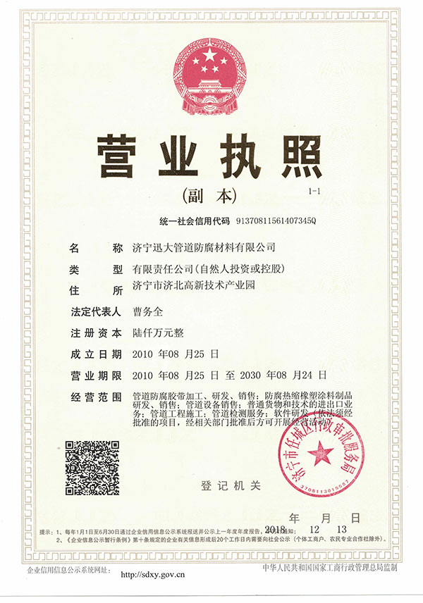 濟(jì)寧迅大管道防腐材料有限公司,位于山東省濟(jì)寧市,濟(jì)北產(chǎn)業(yè)園區(qū)1號(hào),被業(yè)內(nèi)稱為“迅大防腐膠帶”、“山東防腐膠帶”或“山東迅大膠帶”。迅大防腐膠帶,距日蘭高速出口濟(jì)寧北500M,距濟(jì)寧機(jī)場(chǎng)20KM,距京滬鐵路兗州站20KM,距京滬高鐵曲阜站40KM。呼市、西安、昆明、沈陽(yáng)、哈爾濱、深圳等國(guó)內(nèi)主要城市航班,來(lái)訪便利。迅大防腐膠帶,國(guó)內(nèi)防腐膠帶生產(chǎn)廠家。迅大防腐膠帶,以防腐膠帶,管道防腐膠帶,粘彈體防腐膠帶,聚乙烯防腐膠帶,聚丙烯防腐膠帶技術(shù)為依托,先后為生產(chǎn)出聚乙烯防腐雙面膠帶、聚乙烯電子絕緣膠帶、鋁箔汽車止震隔音膠帶、別墅瓦楞基角防水膠帶、船用防腐膠帶、高速公路路基膠帶、耐高溫膠帶、耐低溫膠帶等十幾個(gè)產(chǎn)品。迅大防腐膠帶,防腐膠帶,管道防腐膠帶,粘彈體防腐膠帶,聚乙烯防腐膠帶,聚丙烯防腐膠帶行業(yè)涉及油氣管道、化工管道、冶金管道、市政管道、水利管道、煤制氣管道、煤變油管道、輪船碼頭、電廠管道等十多個(gè)行業(yè)。 迅大防腐膠帶,多次與防腐膠帶企業(yè)同臺(tái)競(jìng)標(biāo)現(xiàn)場(chǎng)抽樣,得到……